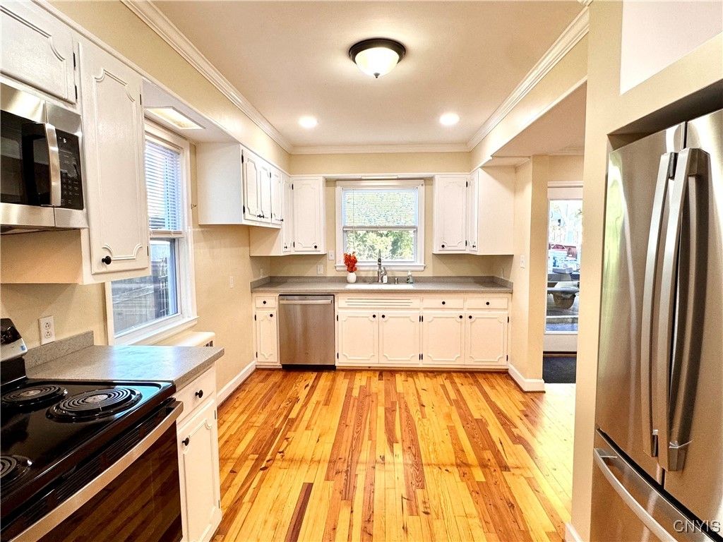 Gorgeously remodeled, this 3-bedroom home is truly move-in ready and designed for modern living with timeless charm. Step inside to find beautifully refinished hardwood floors that look brand new, freshly painted interiors with crisp trim, crown molding, painted doors, and widened entries that create an open, welcoming flow. The kitchen shines with new countertops, all-new appliances - including a dishwasher, refrigerator, gas stove, and mounted microwave - and updated fixtures, making it a perfect space to cook, gather, and entertain. All three bathrooms have been thoughtfully refreshed, featuring stylish new vanities, fixtures, and a tiled shower for a fresh, contemporary feel. Major updates give peace of mind, including a new roof, new windows, all-new electric wiring, and new light fixtures throughout. The exterior has been completely painted, and fencing has been added for extra privacy. A carport and newly added backdoor bring convenience and natural light. The owners have also maximized the home's potential by improving attic access for storage and partially finishing the basement with paint and updates - offering plenty of opportunity for additional living space. This home blends quality craftsmanship with comfort and practicality - perfect for those seeking a modernized home with character and space to grow.