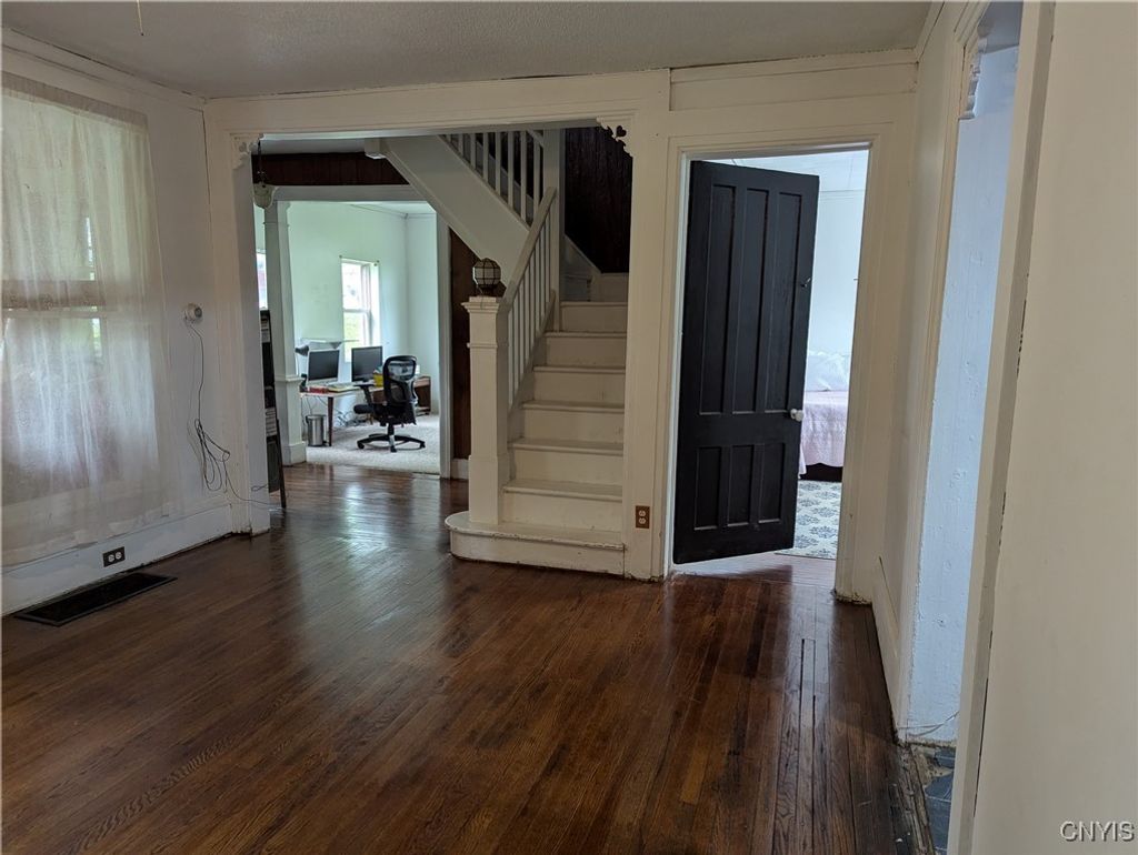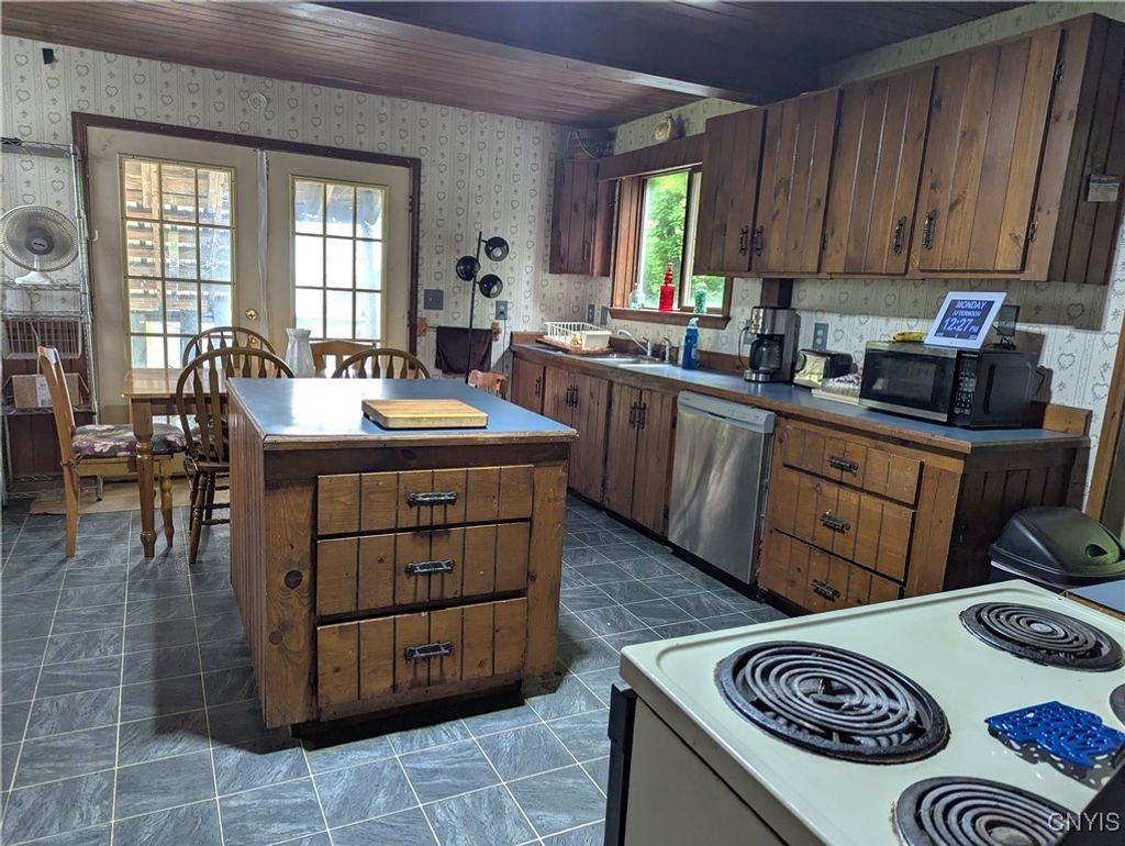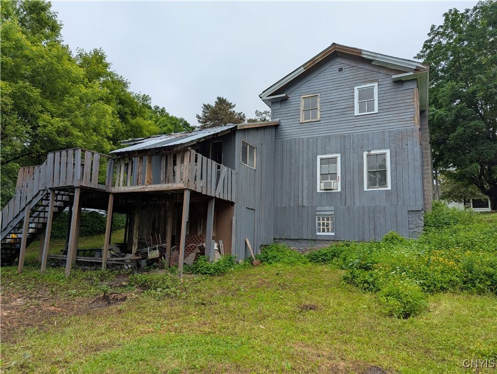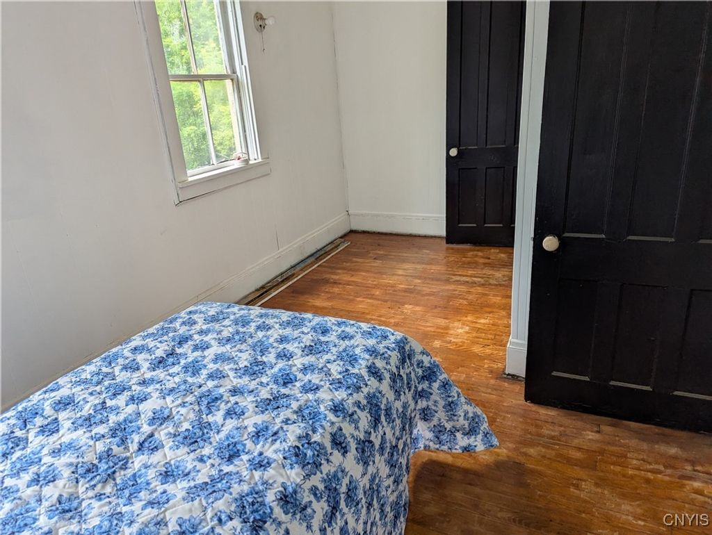 Welcome to this Boonville village home featuring an enclosed porch, refinished hardwood flooring and first floor bedroom and bathroom. The spacious country kitchen has a large center island and comes fully applianced with electric stove, refrigerator and dishwasher. At the back of the kitchen is a rear deck with new support beams overlooking the back yard. And off the kitchen is the laundry room and basement access. On the second level are two adjoining bedrooms and walk in attic space for storage. All of this comes with a circular driveway, barn style garage/storage space, 6 new windows, 2 new exterior doors, fresh paint throughout and over 4 acres of land with a stream running at the rear of the property.
