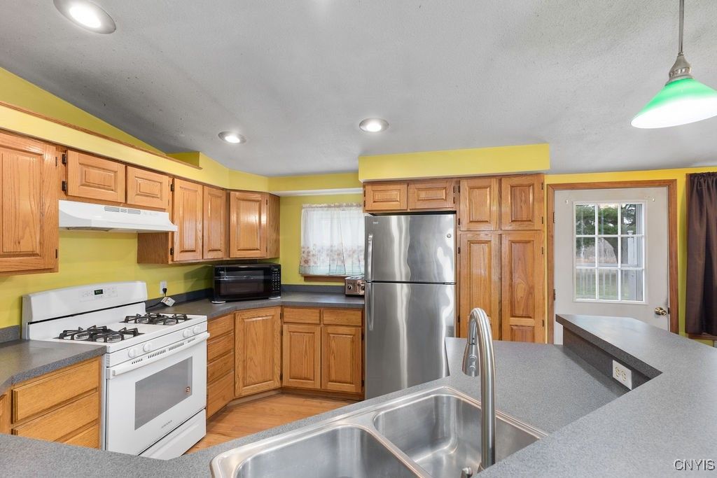 This well-kept 1,218 sq ft home offers comfortable one-floor living with two spacious bedrooms and two full baths. The primary suite features a generous walk-in closet and its own private bathroom. A large living room with a wood-burning fireplace provides a warm, inviting space to relax, while the kitchen offers plenty of cabinets, a breakfast island, and direct access to the back deck. The second bedroom has a double closet, and the second full bath includes the washer and dryer for added convenience. Step outside to an oversized deck overlooking a peaceful yard with a creek and walk bridge that leads to the deep, expanded backyard. A storage shed gives you plenty of additional space. Situated on 1.84 acres, this property also features several recent updates including Comfort Windows (transferable warranty), a newer roof, and a new front door. Sellers are selling the house as is.