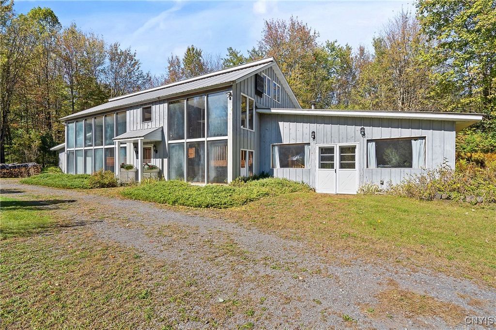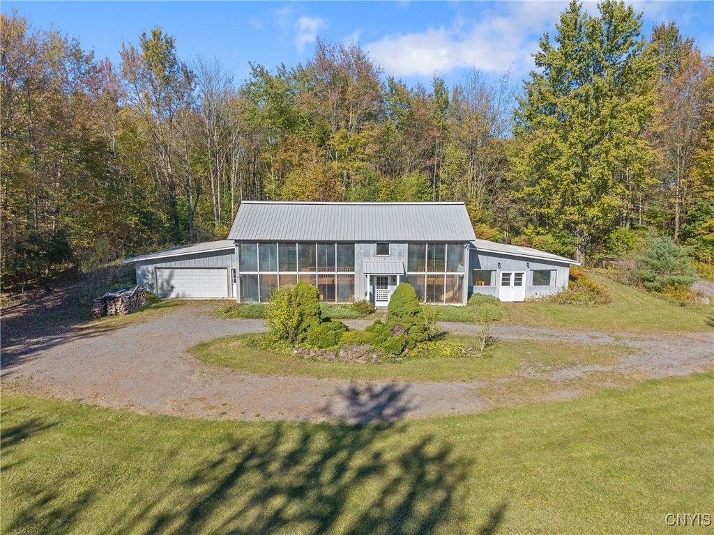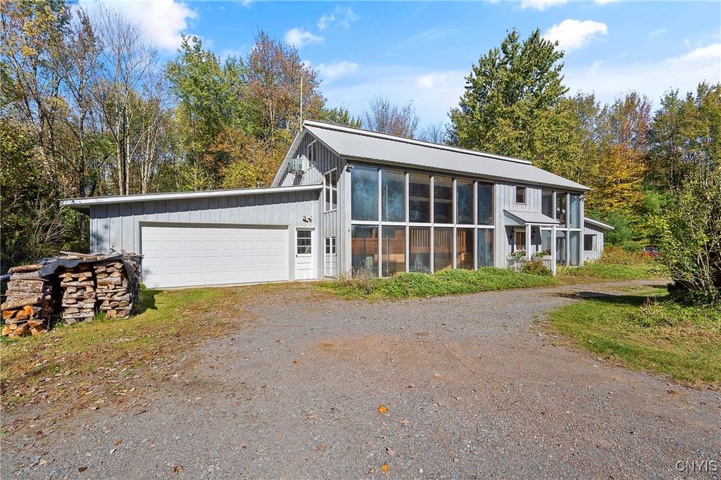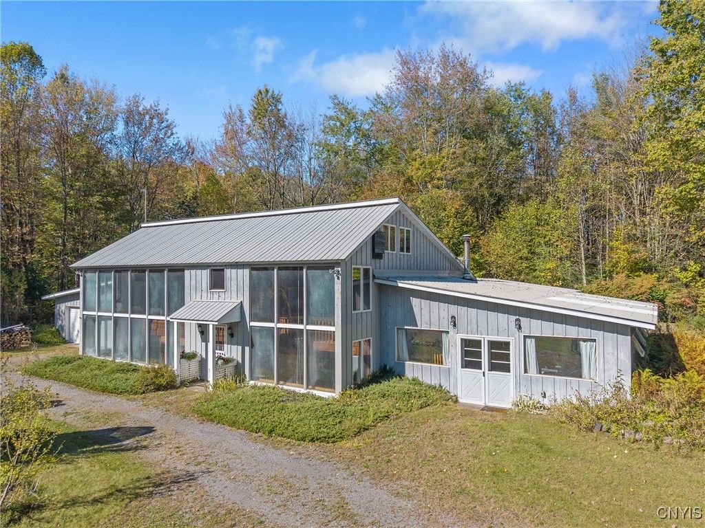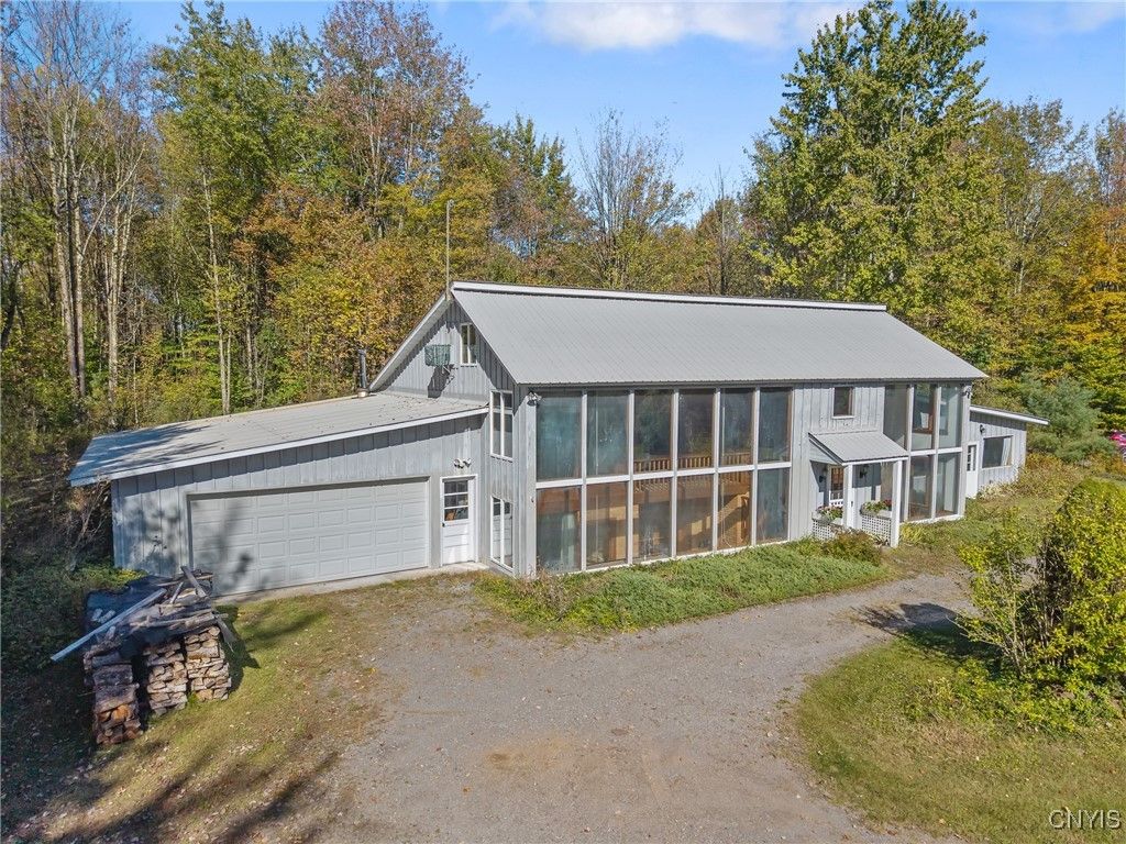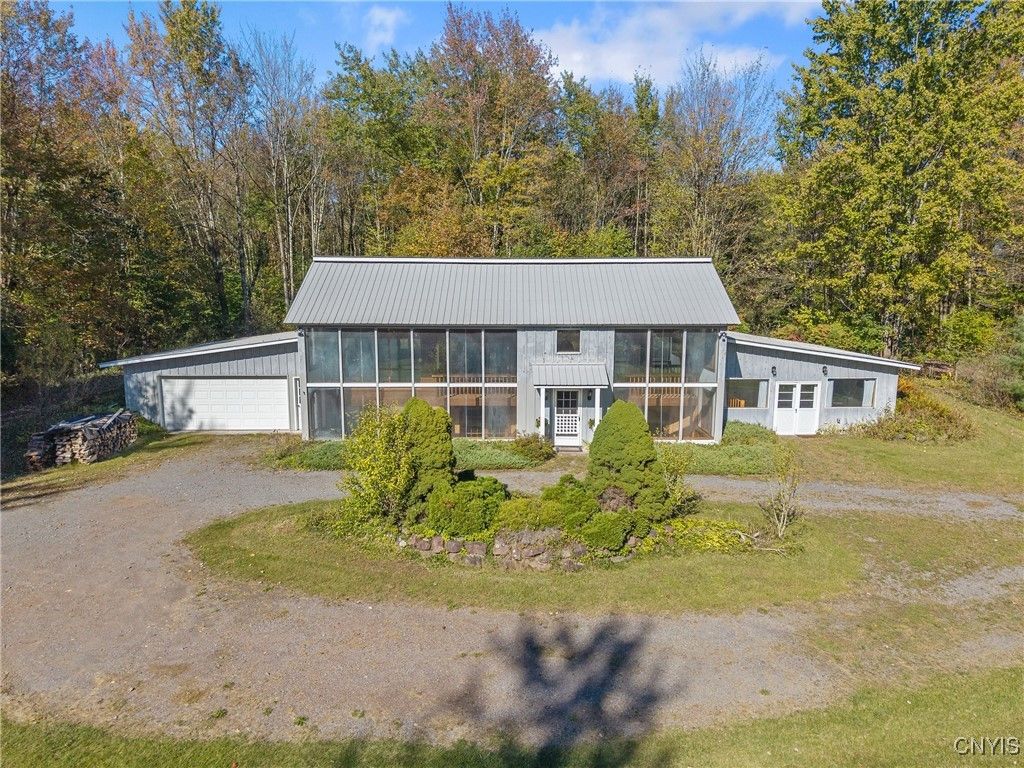 Welcome to Hilltop Hideaway, a truly one-of-a-kind passive solar home designed to live in harmony with the seasons. If you've ever dreamed of waving goodbye to your heating bills, this home makes it possible! Built directly into the hillside, its natural berm design and two-story wall of south-facing glass capture sunlight throughout the day to warm the interior and help keep it cool during the summer months. Spanning nearly 2,000 square feet, this custom-built retreat offers three to five bedrooms and two full baths in a layout that blends comfort with creativity. The main level features three bedrooms including a brand-new primary bathroom, a spacious craft or hobby room, and multiple walkouts to the Sunspace Atrium.On the second level, you'll find a vaulted living room with exposed wood beams and a stunning brick fireplace, a bright open kitchen and dining area, an office (or 4th bedroom),even a hidden loft library accessed by ladder - a charming surprise that adds to the home's personality and warmth. The home's defining feature is the two-story Sunspace Atrium - an extraordinary light-filled area that serves as both a greenhouse and a natural heat source. Each bedroom opens into this space through French doors and private balconies, letting in sunlight and offering gorgeous views of the property's wooded surroundings. It's a dream come true for gardeners, plant lovers, or anyone who craves the serenity of natural light year-round. When it comes to comfort, you'll have your choice of three heat sources - a wood furnace that radiates heat through the concrete floor slab, a cozy wood stove, and a propane fireplace. The back of the home is built into the earth, providing exceptional insulation and energy efficiency.Outside, you'll find two garages, an attached two-car and a detached oversized two-car with a heated workshop in back plus a full gym/mechanical space, a garden shed with patio and fire pit, and a screened-in gazebo tucked among the trees for the perfect private retreat. Set on over 27 wooded acres, it offers privacy, tranquility, and endless opportunities for outdoor enjoyment.
