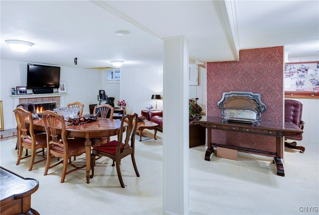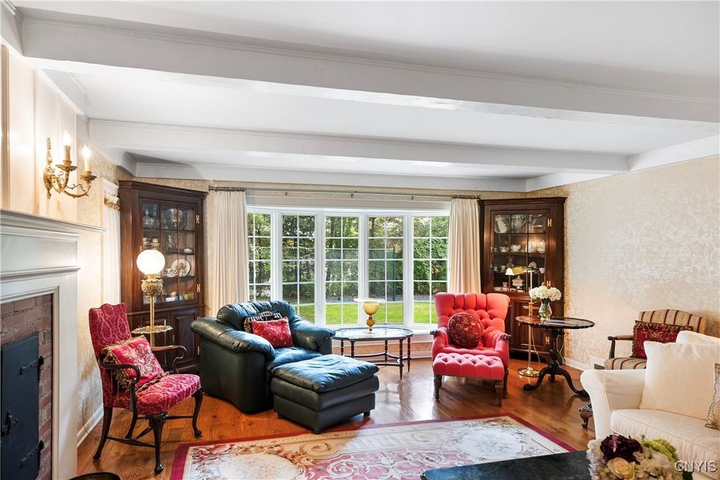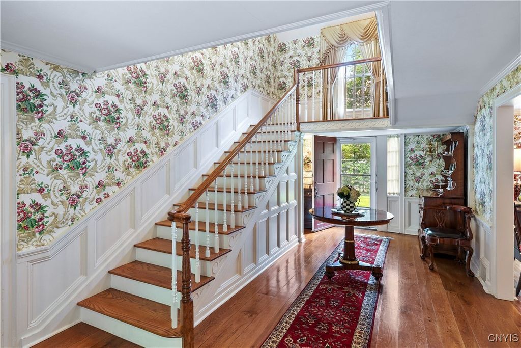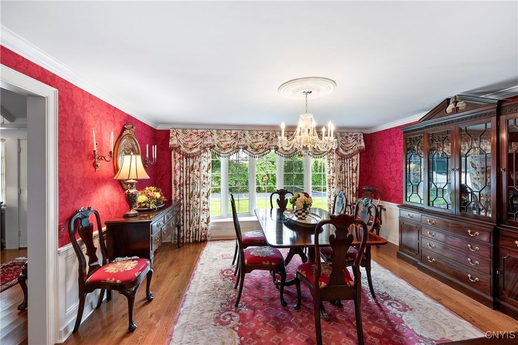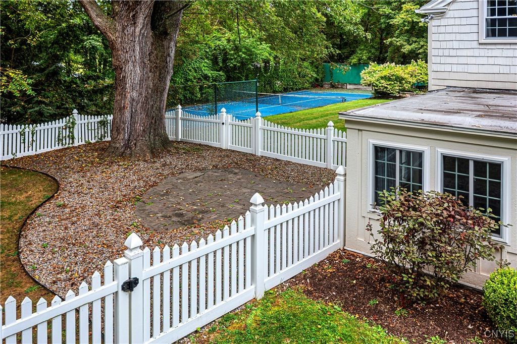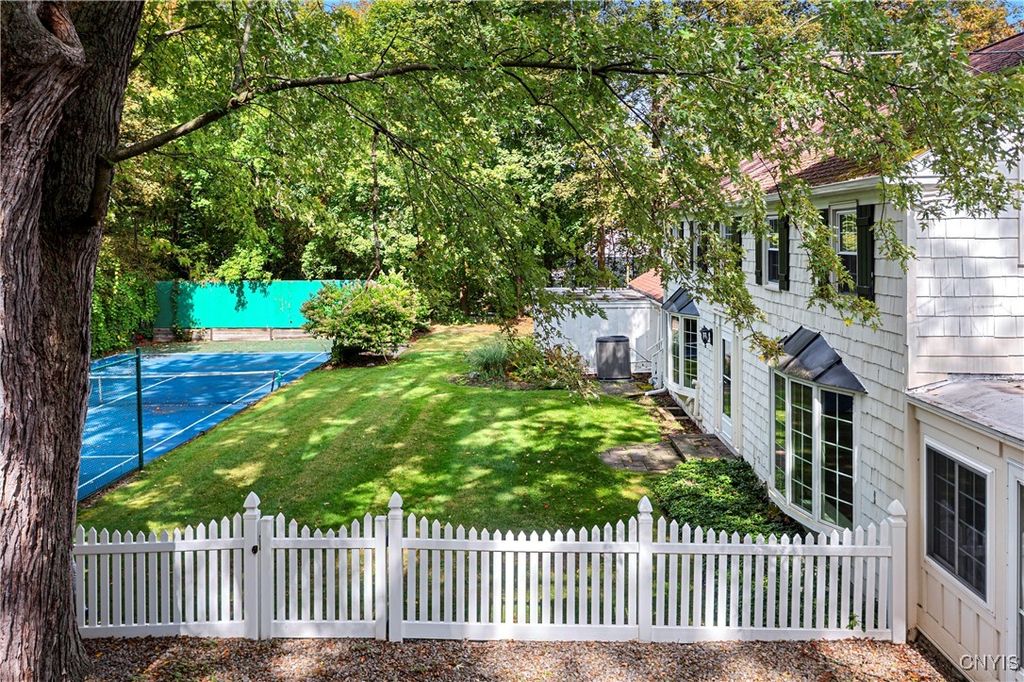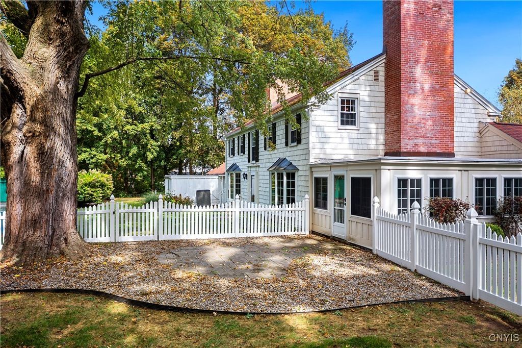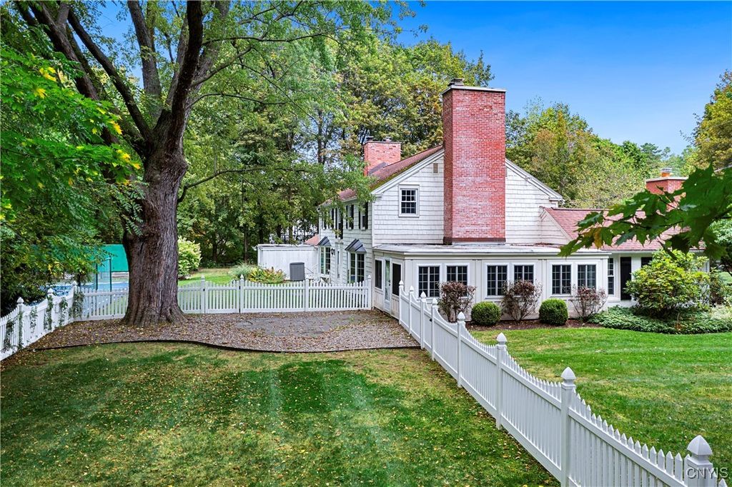 DeWitt Luxury Living on a Private .8-Acre Lot Experience timeless elegance in this beautifully maintained colonial, perfectly situated on a spacious, private .8-acre wooded lot. Inside, gleaming moldings, a grand staircase, and abundant natural light welcome you into a refined yet inviting living space. The cozy living room features a wood-burning fireplace, while the formal dining room sets the stage for memorable gatherings. The gourmet kitchen impresses with white cabinetry, granite countertops, and upscale appliances, flowing seamlessly into the family room, which boasts rich wood paneling and a warm gas fireplace. Step outside to the three-season porch overlooking lush, landscaped grounds, and a fenced in area for pets. Ideal for morning coffee or evening entertaining. Upstairs, three generous bedrooms include a luxurious primary suite with walk-in closet and spa-like bath. An updated second-floor bathroom adds modern comfort for family and guests. The partially finished basement includes a small workshop and a gas fireplace and provides additional living space or recreational flexibility. Enjoy outdoor amenities including a fenced yard and private tennis court, all just minutes from JD schools, and less than a mile to Wegmans and Route 481, offering easy access to Syracuse and the surrounding region. Move-in ready and impeccably cared for, this home offers classic colonial charm with modern updates for today's lifestyle.