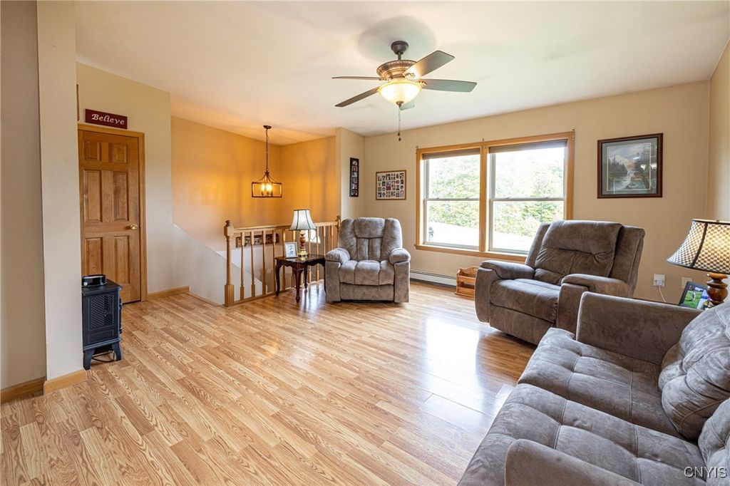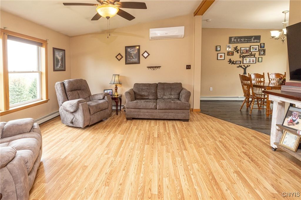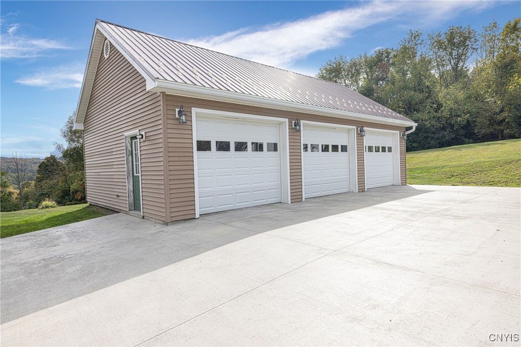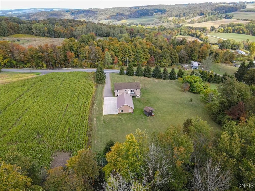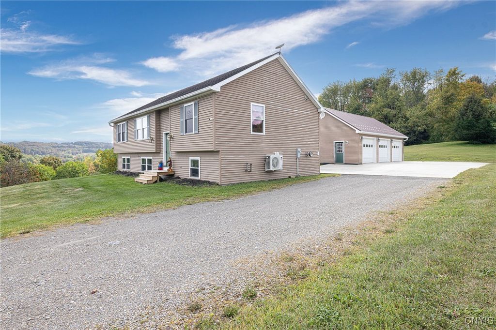 Updated raised ranch with a three-car garage set on 2.69 acres overlooking the scenic valleys and hills of Niles, New York. This home features 3 bedrooms, 2 full baths, and an open-concept floor plan that seamlessly connects the kitchen featuring updated appliances, dining room, and living area. The primary suite includes a spacious, bright bedroom with oversized bathroom / vanity with double sinks and a spacious closet. A large unfinished basement offers endless potential for additional living space, storage, or recreation. Modern split-unit HVAC systems provide efficient heating and cooling throughout the home. The three-car garage is insulated with heating / electric, designed as a versatile shop or workspace. Located in the heart of the beautiful Finger Lakes region, this property combines country living with comfort and convenience.