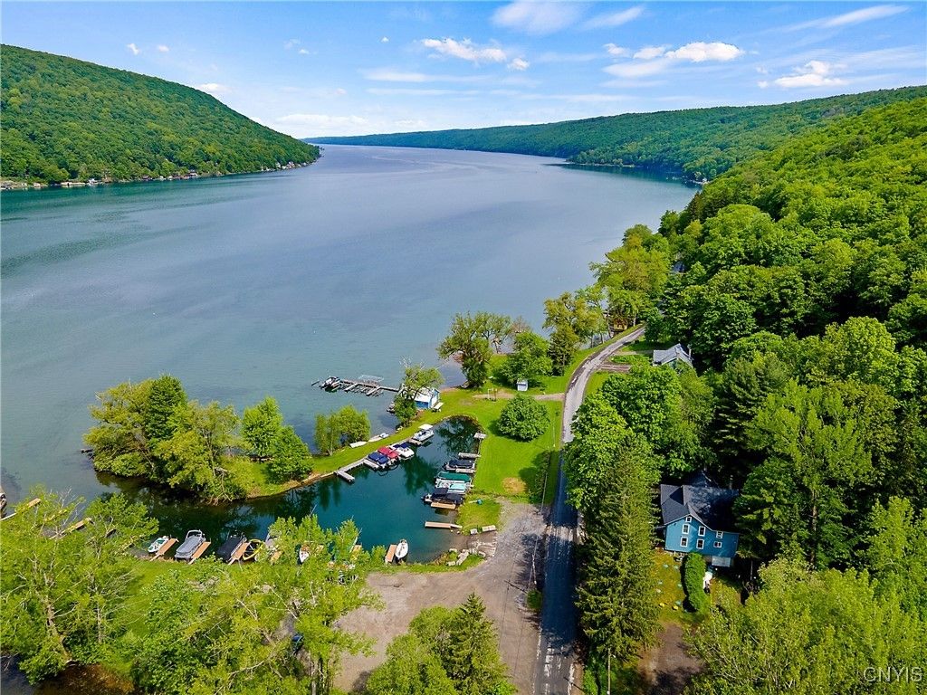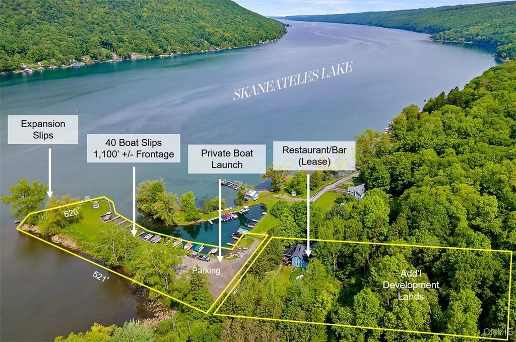 The Glen Haven Restaurant & Marina consists of 5.5 acres with over 1,100' of private waterfront, being 1 of 2 private marinas on Skaneateles Lake. The marina offers 40 Boat slips (fully leased year-by-year), private boat launch memberships program, a turn-key marina business and a successful full-service restaurant with a year round, 10 year lease in place. The boat launch is privately owned and is one of the only access points to the lake for boaters outside of the state launch. Three separate units make up the property, first floor restaurant and bar, second floor unit short term rental accommodation operated by the restaurant, and third floor is an additional apartment which can be used for personal, private, use or rented as additional income source. Rare opportunity to own a lake front property with existing income and unlimited expansion potential. Property can serve as a full-time year round residence or potential to build your dream home on the acreage.