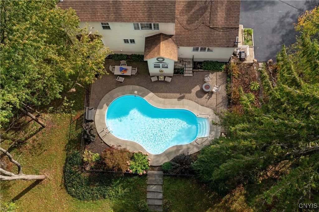 Stylish 4 bedroom, 2 1/2 bath, colonial located in an enchanting 1.84 acre location. This stunning home, designed with an artist's eye features a family room, hardwood floors, gas fireplace capped with black granite & hearth. Granite kitchen countertops, butcher block, center island, imported tumbled marble backsplash, imported ceramic tiled floors, endless cupboards & pantries is a recipe for culinary success. A laundry room with cupboards is a helpful addition just off the kitchen. The formal dining & living rooms' smooth transition creates an elegance with painted distressed walls & its hand painted original landscape mural. 1st.floor bedroom#1 /office & full bath are uniquely executed with a Venetian plaster wall technique (wheelchair accessible). 2nd floor bedroom#2 provides excellent acoustics for its Home Theater , pull-down wall screen & blackout curtains. Endless amenities in bedroom #3 's en suite includes bookshelf wall, satellite assessable TV, built-in desk, internet assessable computer station, & walk-in closet. The en suite 1/2 bath is just a pocket door away. The Primary bedroom #4 Suite offers: walk-in closet, custom built-in headboard, chandelier, & hand-painted mural. The Basement houses a utility room, workshop, wood-shop, family/game room &/or gym. Outdoors: Your In-Ground Heated Pool, fire pit & patio open to gardens of flowers & trees, Courtyard Patio, & Bird watching / Feeding circle. Roomy 2car garage houses vehicles & storage. Enjoy the Forest Back Acre fire pit where communing with nature will come naturally . IMPORTED STOVE FROM ITALY IN KITCHEN WILL NOT CONVEY..SELLER TAKING IT.